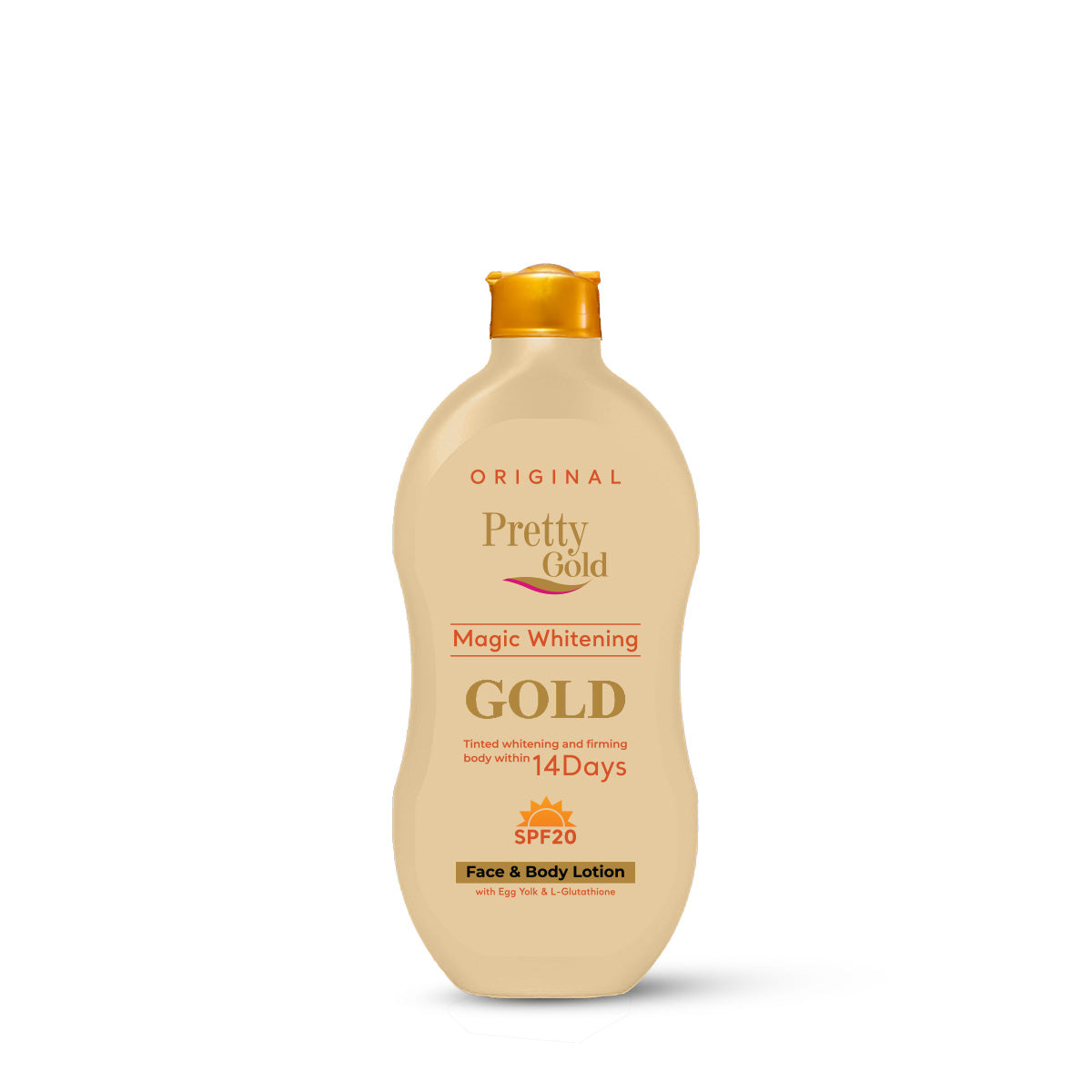 Pretty Gold Magic Whitening Face & Body Lotion is enriched with the goodness of Egg Yolk, which promotes hydration, and L-Glutathione, which is globally proven to improve skin tone and make it fairer. It also contains SPF 20 which protects your skin from harmful sun rays. In just 14 days, get tinted whitening and body firming!